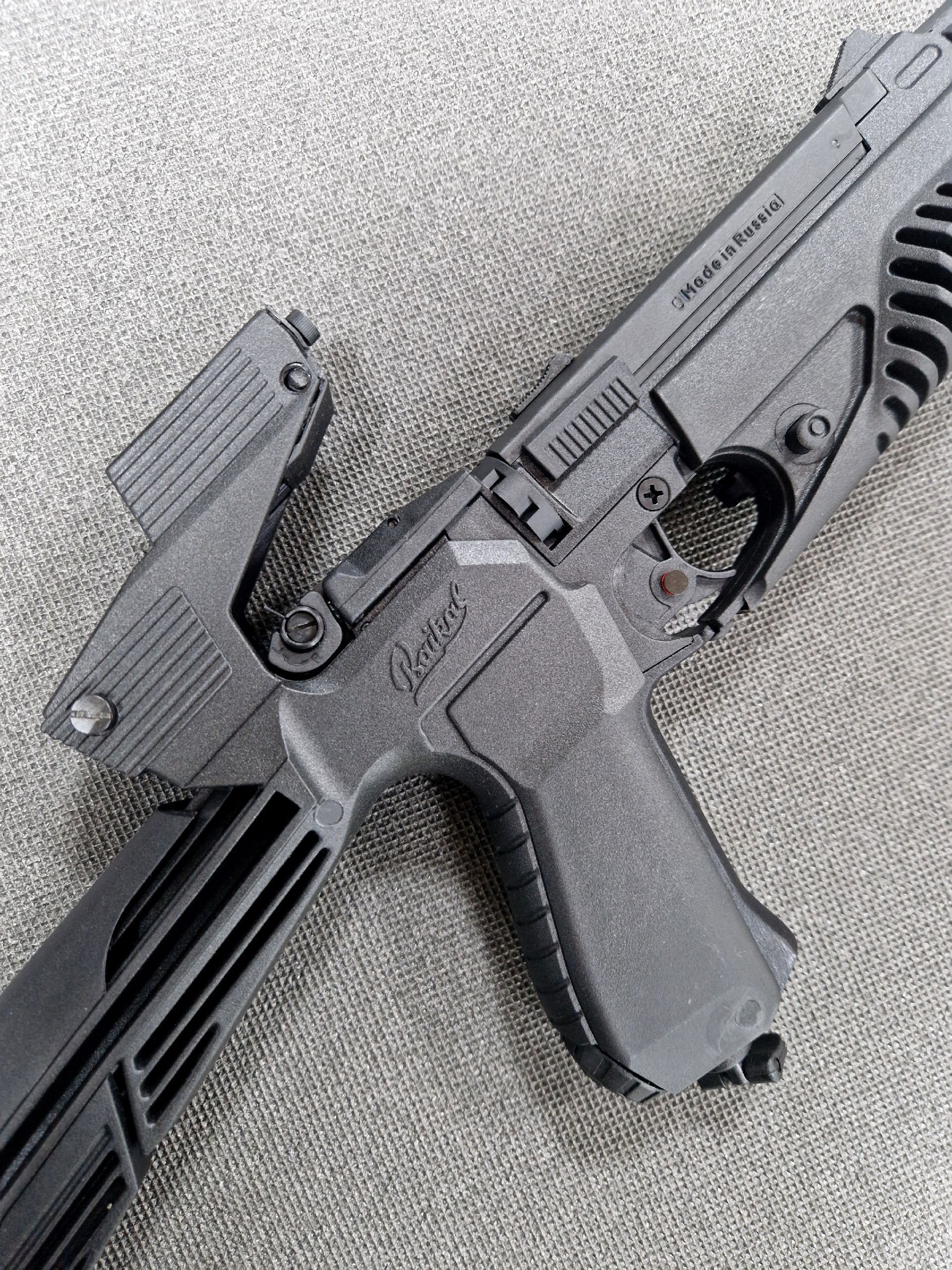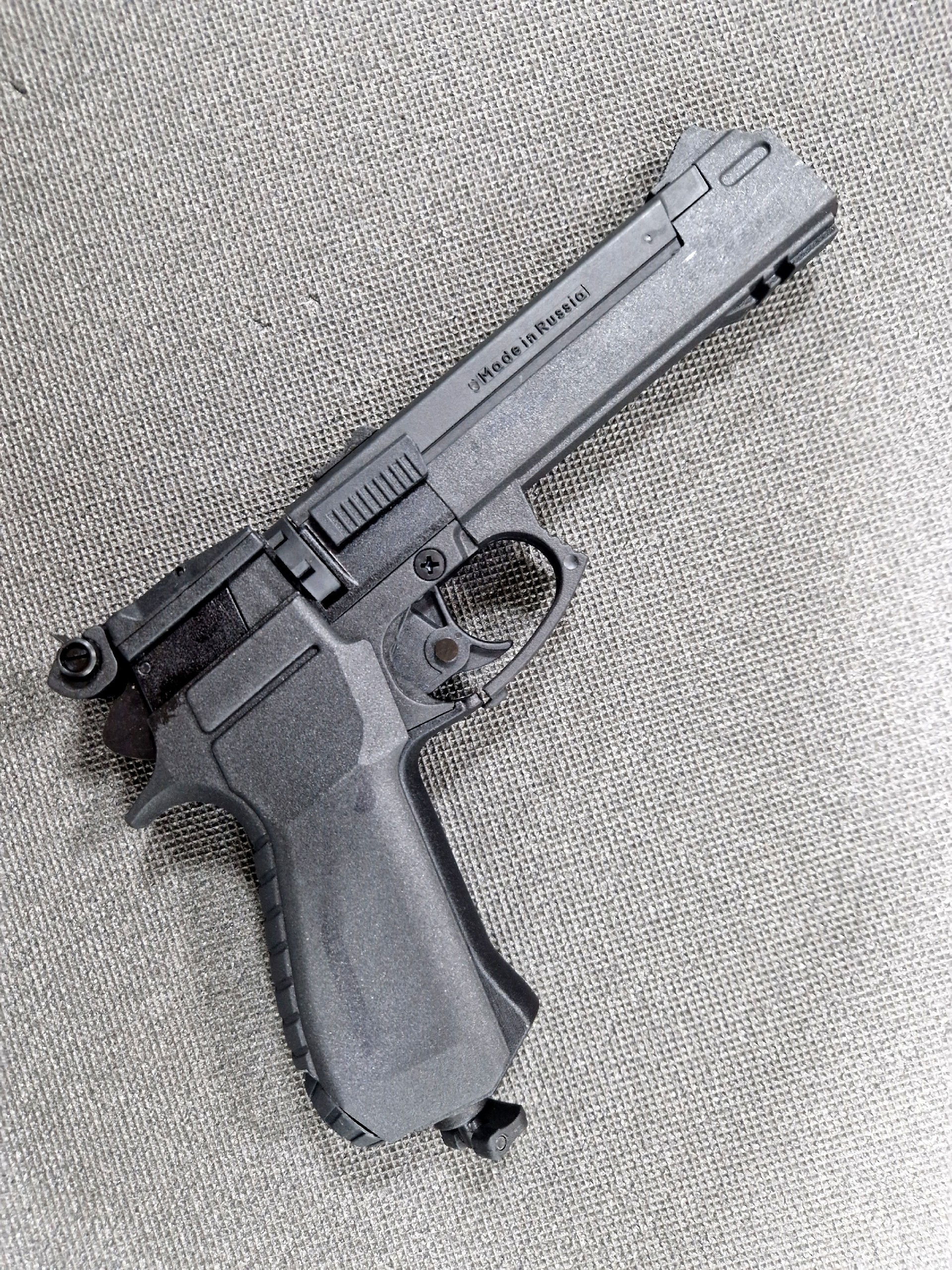 Питание осуществляется от стандартных 12-граммовых баллончиков CO₂, которые устанавливаются в рукоять. Прицельные приспособления включают мушку и регулируемый целик с удобной настройкой по горизонтали и вертикали. Под стволом расположена планка Пикатинни для монтажа тактического фонаря или лазерного целеуказателя. Для безопасности пистолет оборудован кнопочным предохранителем, встроенным в спусковой крючок.