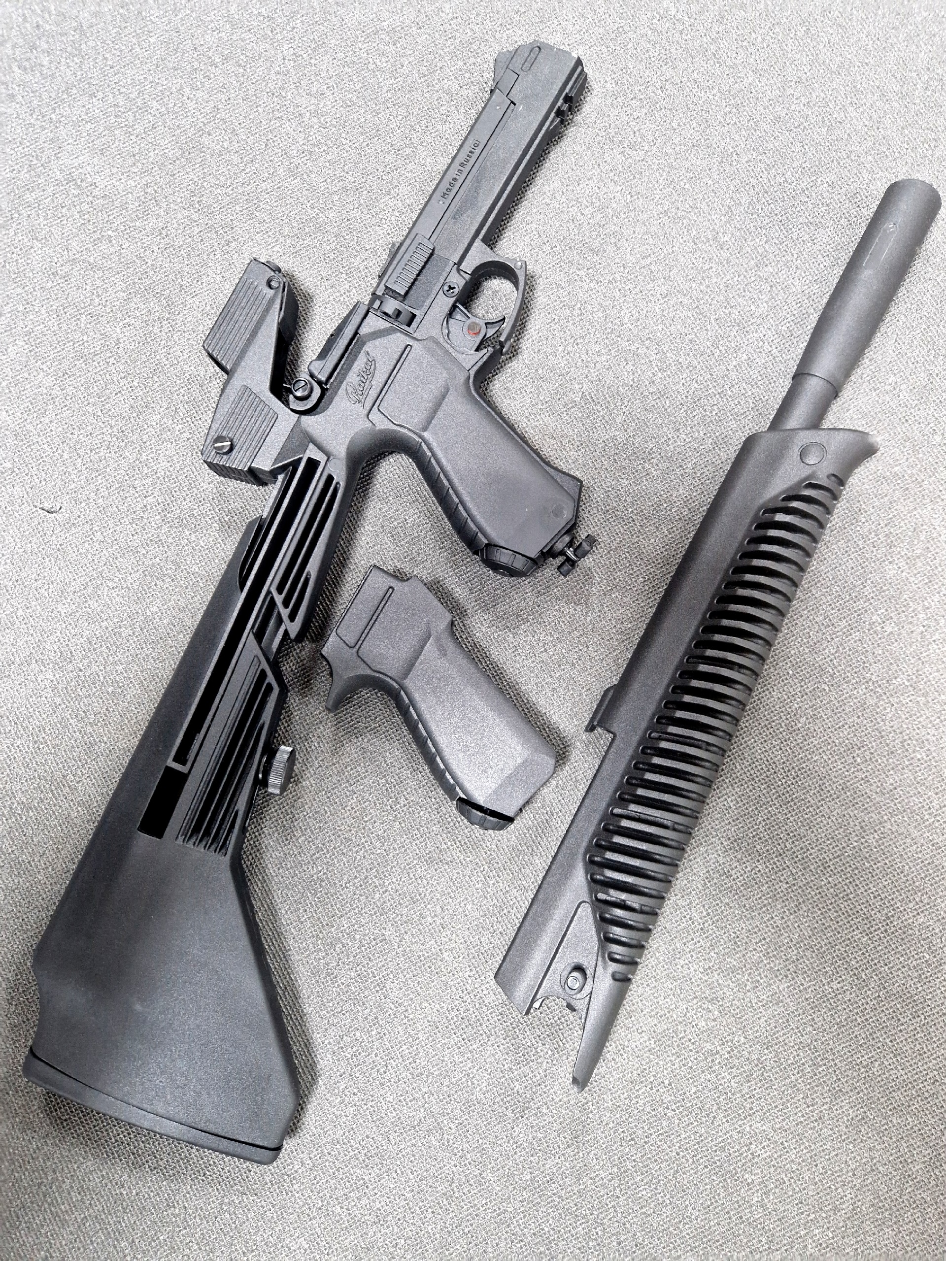 В качестве боеприпасов можно использовать свинцовые пули или стальные шарики BB. Для пуль предусмотрен сменный барабан на 8 зарядов, а для шариков — встроенный магазин на 23 BB, что в сумме даёт до 31 выстрела без перезарядки.