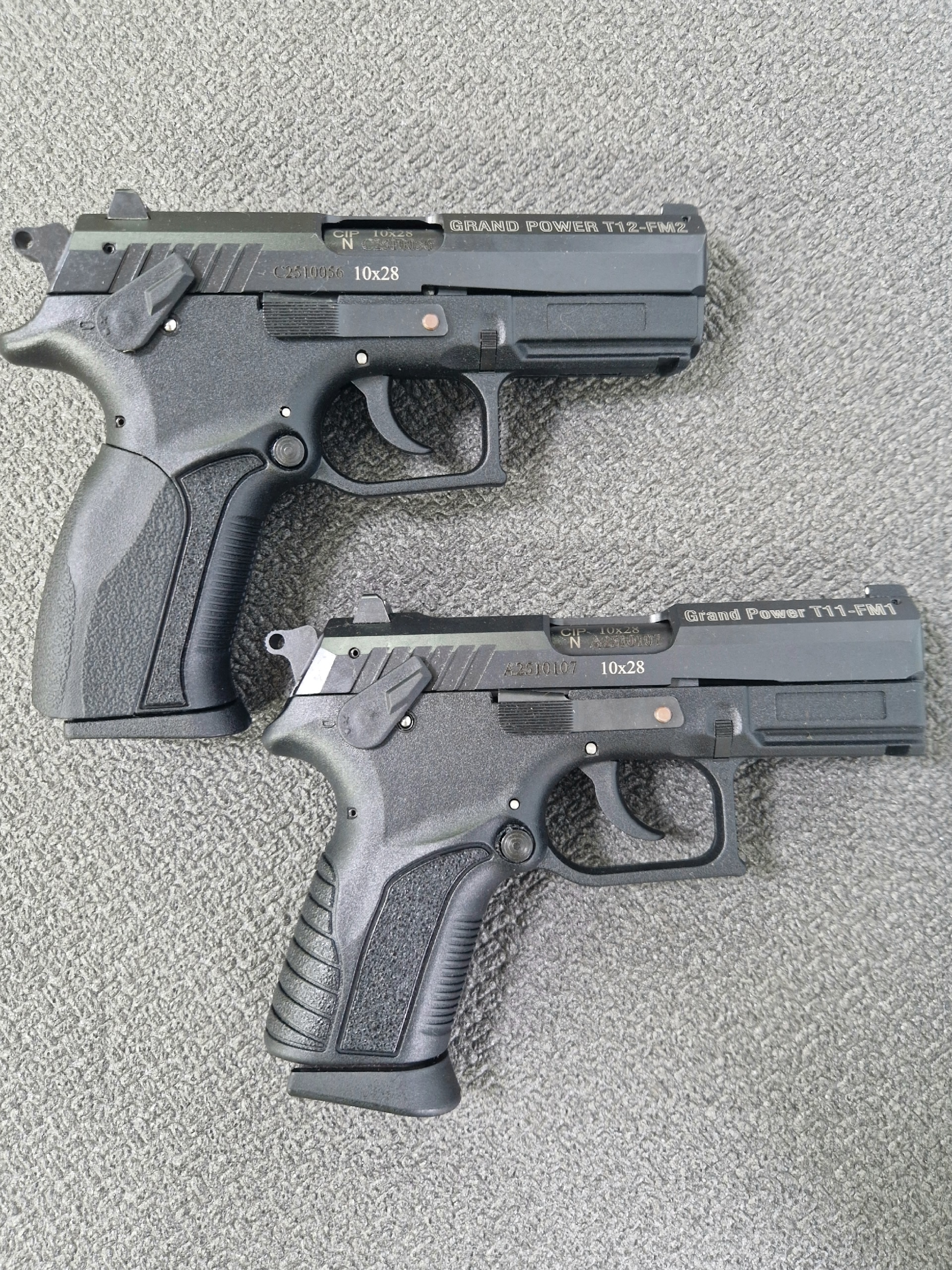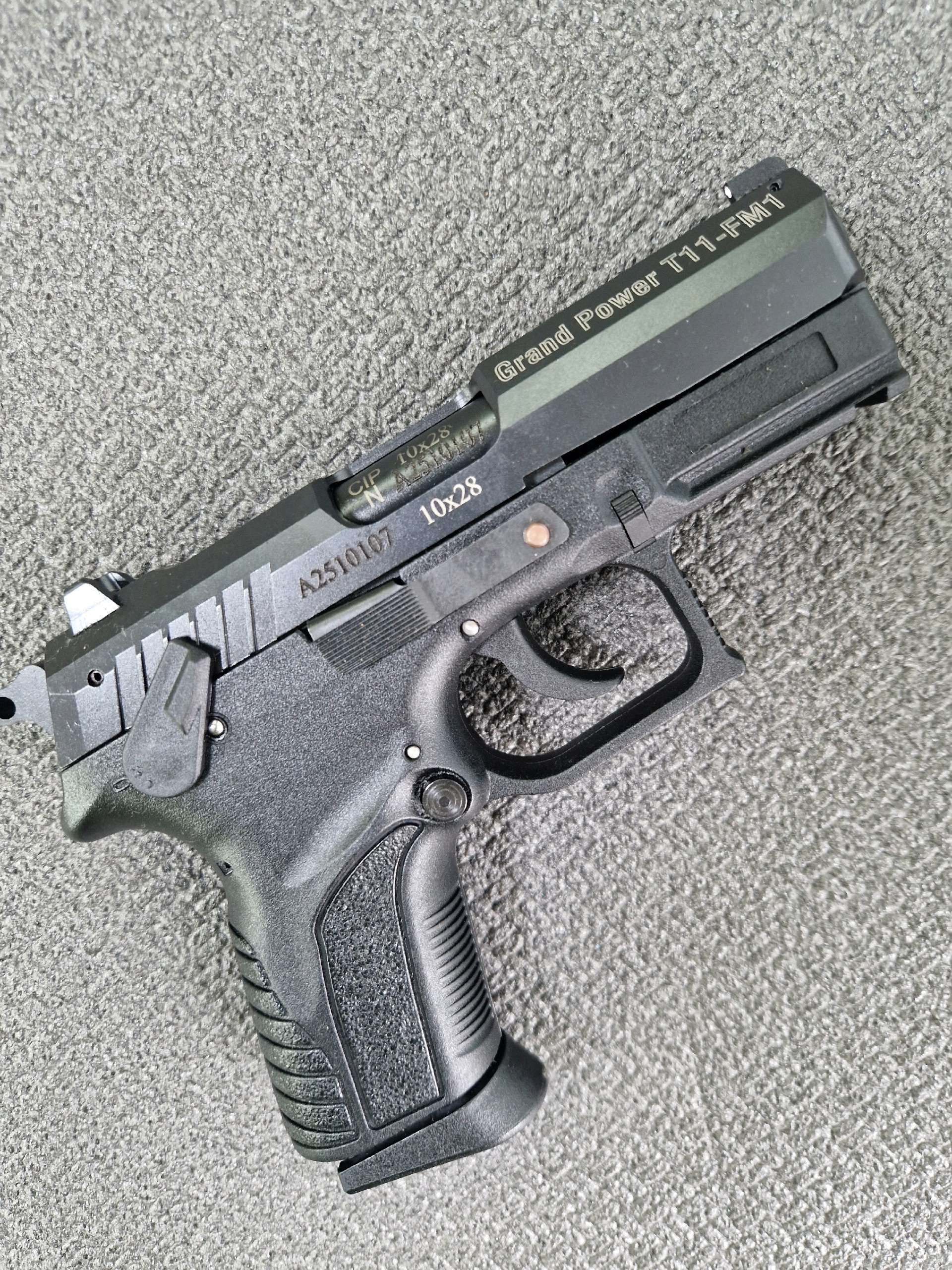 Grand Power T11-FM1 10x28 – более компактная модификация Т12. На стволе отсутствуют проточки. На выходе и входе в предкамеру располагаются штифты. Кроме того, ствол имеет длинный гладкий участок, стабилизирующий шарик при выстреле. Воронение ствола изнутри и снаружи значительно увеличивает срок эксплуатации пистолета.