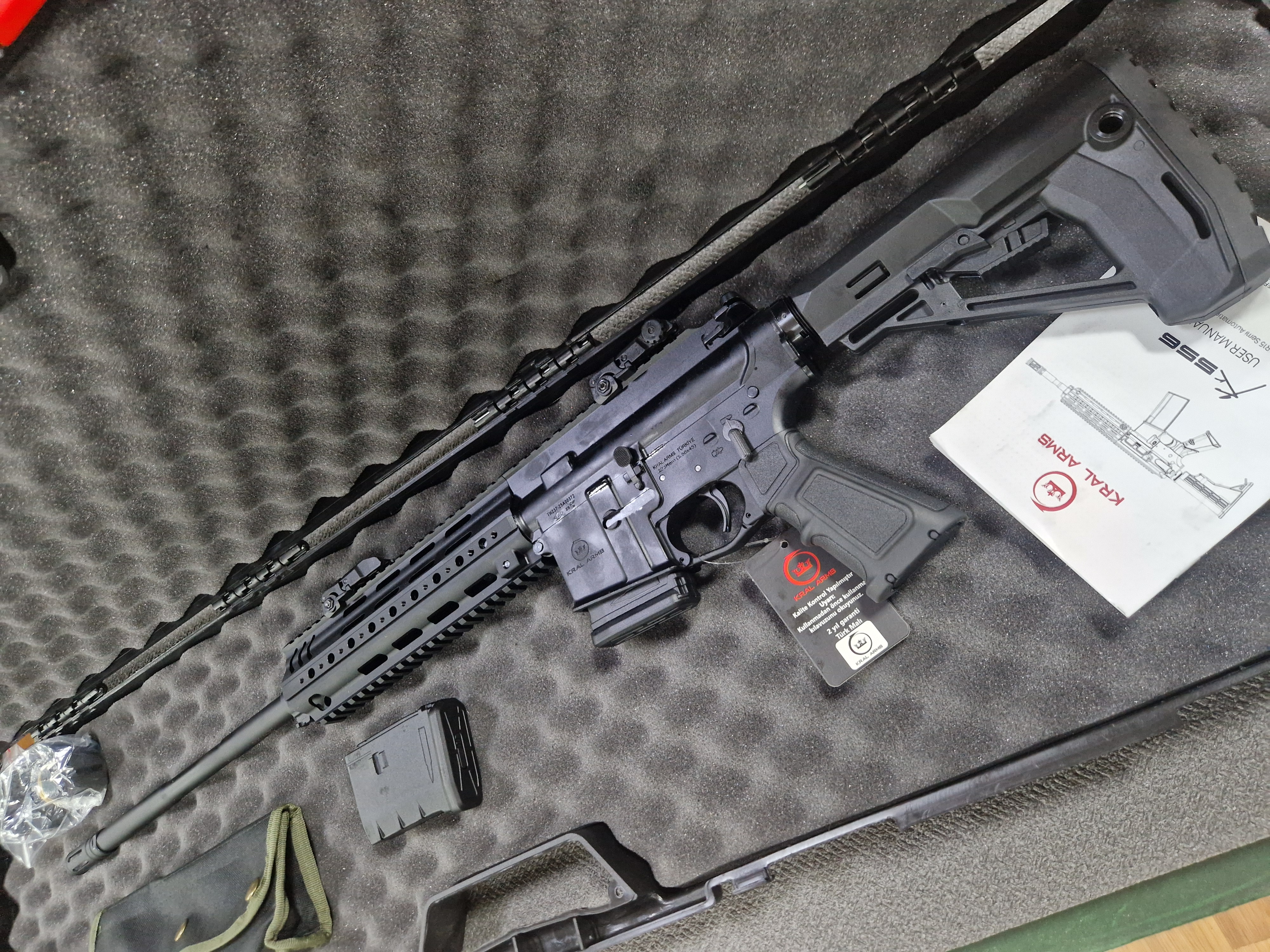 Карабин оснащен типовой для AR-платформы кнопкой досылателя (Forward Assist). Приклад выполнен из пластика, телескопический, с возможностью регулировки (3 фиксированных положения). Магазин - отъемный, коробчатый.