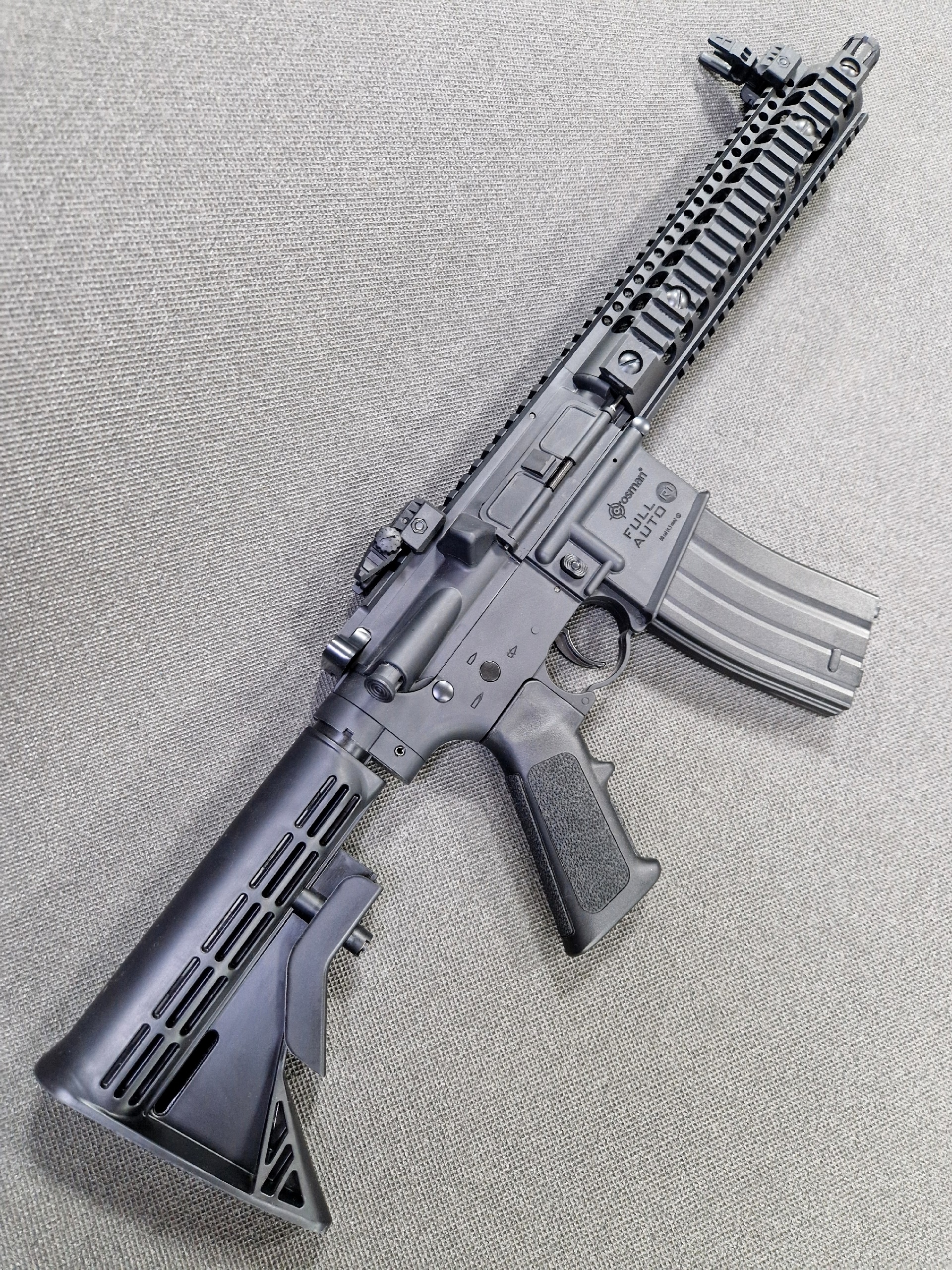 Пневматическая винтовка Crosman R1 — реалистичная копия карабина M4 на AR-платформе. Есть возможность автоматического огня, скорострельность до 1400 выстрелов в минуту. Идеально для любителей динамической стрельбы.