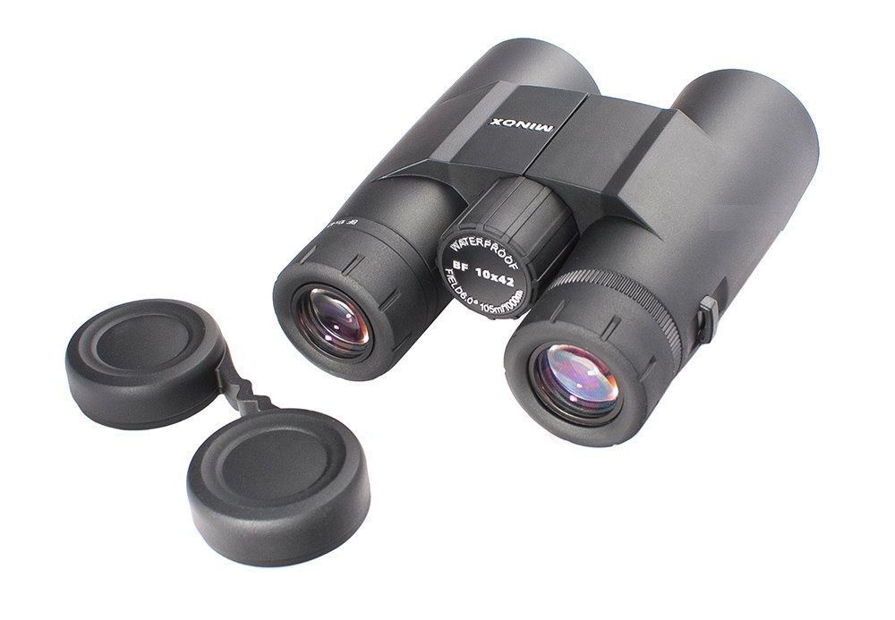 Бинокль MINOX BF 10x42 отличается высококачественным изображением и эргономичным дизайном, прекрасно подходит для применения во всех областях – от охоты до спортивных игр, а также для наблюдения флоры и фауны в естественных условиях. Он выполнен в ударопрочном алюминиевом корпусе с плотным резиновым покрытием, которое защищает прибор от пыли и внешних механических повреждений, не скользит даже во влажных руках и обеспечивает надёжный хват. Меньший вес и компактность (по сравнению с биноклями, имеющими аналогичные оптические параметры) обеспечивается за счёт использования в оптической схеме Roof призм. Полная защита внутренней оптической системы и точных механизмов от воды и атмосферных осадков обеспечивается благодаря применению высококачественных уплотняющих материалов: бинокль MINOX BF 10x42 может выдержать даже непродолжительное пребывание в воде на глубине до 3 м без нарушения герметичности. Заполнение азотом предотвращает образование конденсата на внутренней поверхности линз даже при очень резких перепадах температур. Нанесение на все линзы запатентованного многослойного (до 21 слоя) просветляющего покрытия Minox М* улучшает светопропускание оптической системы и позволяет получить яркое и контрастное изображение с естественной цветопередачей и детализацией даже в условиях с пониженным освещением. Для получения оптимальной чёткости изображения на дистанции от 1,2 метра бинокль оборудован системой центральной фокусировки (наведение резкости одновременно для обоих глаз). Индивидуальная настройка межзрачкового расстояния обеспечивает комфортное использование прибора, а большое удаление выходного зрачка (15 мм) и диоптрийная корректировка в широком диапазоне (+ / - 4 дптр) позволяют вести наблюдения как в очках, так и без них.