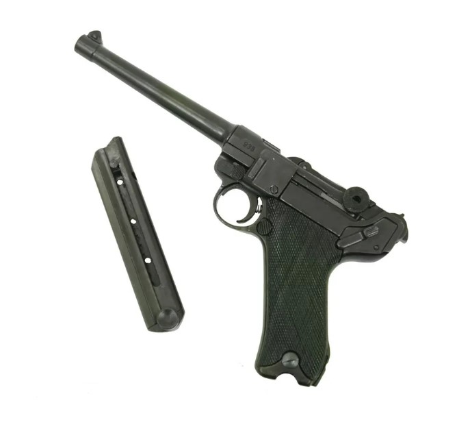 Массогабаритный макет пистолета Люгер P08 DE-1144 с удлиненным стволом 30 см представляет собой модель всем известного пистолета Luger Р.08, он же Парабеллум "Морской".