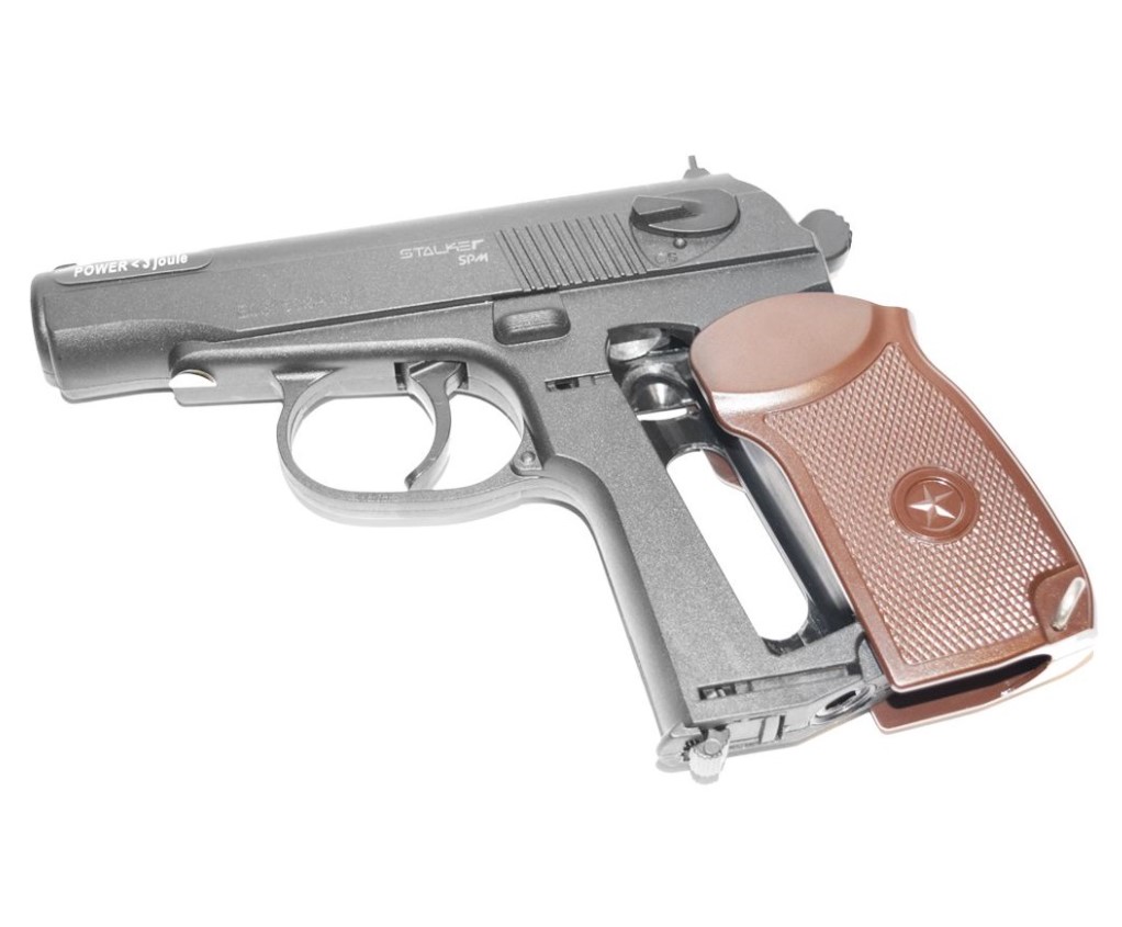 Пневматический пистолет Stalker SPM (Макарова) – это разработка на основе знаменитого Макарова, и внешне не отличается от своего прототипа ни по габаритным параметрам, ни по внешнему виду. Боеприпасы – сферические пули 4,5 мм, магазин на 20 пуль находится в рукоятке, с помощью стальной пружины боеприпасы подаются в канал ствола. Баллон с углекислым газом, который устанавливается в отсек рукоятки, выступает источником энергии, он фиксируется и накалывается специальным винтом скрытой конструкции.