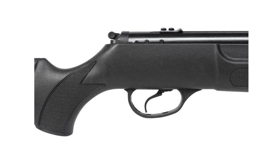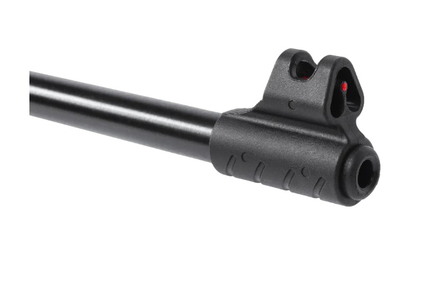 Пневматическая винтовка Hatsan 90 TR отличается черным пластиковым прикладом и удобной ложей типа Монте Карло. На рукояти есть насечки, что исключает эффект скольжения и позволяет лучше контролировать оружие. Благодаря системе Triopad есть возможность регулировать размер приклада, а также она снижает силу отдачи. Кроме того, уменьшению отдачи способствует каучуковый затыльник. Для точного наведения на цель винтовка снабжена открытым прицелом, состоящим из мушки и регулируемой планки. На мушке имеются фиброоптические нити для более комфортной стрельбы на фоне темных объектов и в условиях недостаточной видимости. Также есть планка Ласточкин хвост 11 мм для установки оптического или коллиматорного прицела.